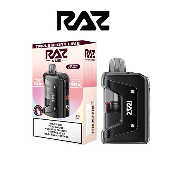 User-centric details elevate the VUE Kit even further: a transparent, replaceable pod pre-filled with 13ml of 5% (50mg/ml) nicotine salt e-juice, allowing you to easily monitor e-liquid levels at a glance. The smooth side HD LED display keeps you informed with real-time power status, battery levels, and fun vaping animations, eliminating guesswork. Plus, the leakproof bottom airflow locks in smooth MTL (Mouth-To-Lung) hits, ensuring a clean, mess-free experience every time. Draw-activated and ready to use right out of the box, the RAZ VUE 50K is perfect for vapers seeking convenience, performance, and a touch of innovation.